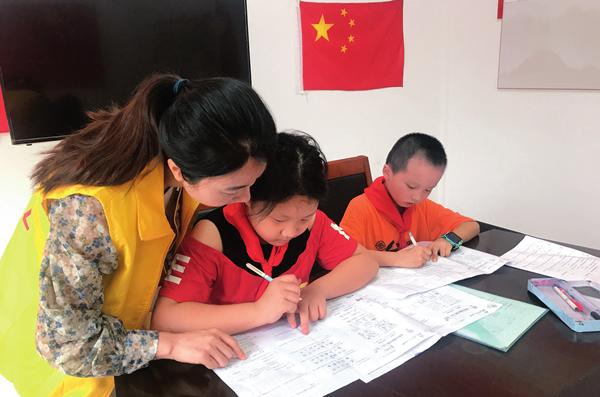 6月7日,长沙市天心区金盆岭街道涂新社区午间课堂老师为无人照顾的孩子们辅导作业 平静摄精准施策助边缘群体走出困境