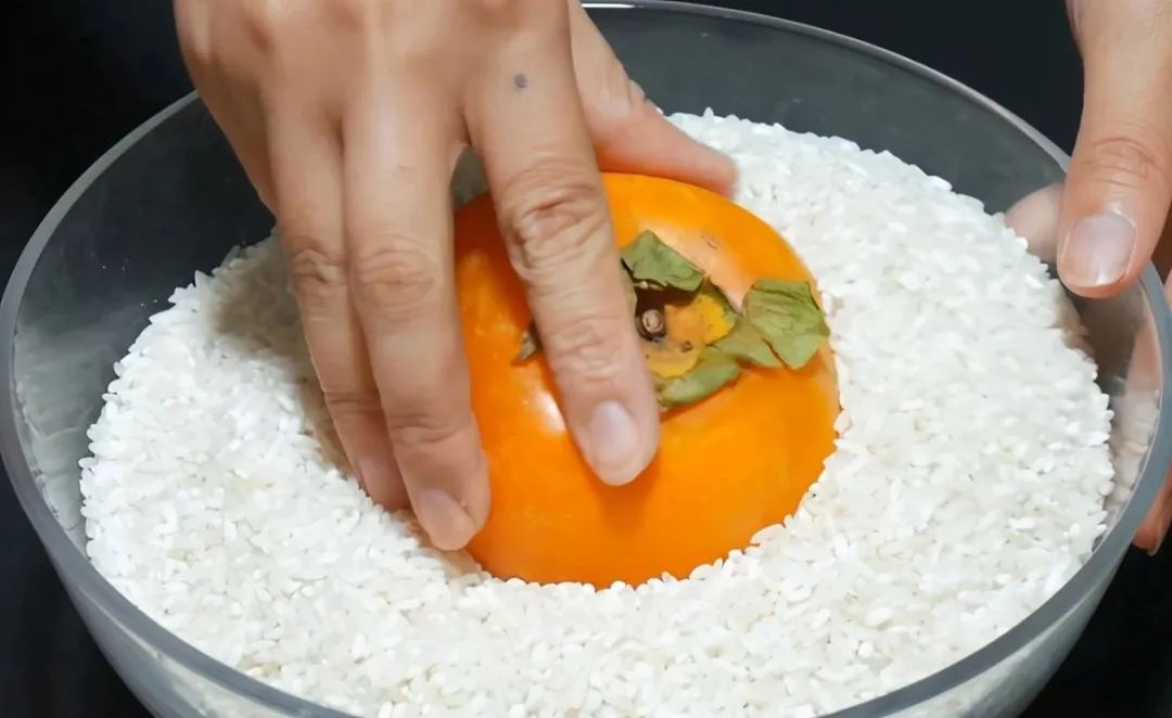 催熟水果最常用的方法就是放进大米里面,我们可以直接把生柿子塞进大米里面,用大米将柿子“埋起来”就可以了,一般5天左右柿子就能完全成熟了。