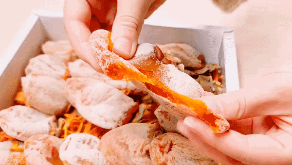 收获的柿子,削皮并晾晒。晾晒过程中柿子内部的水混着糖渗到了果实表面,当水分蒸发后,糖结晶积累到表面就形成了白霜。