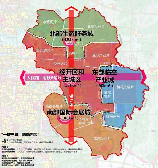“一核”指的是长沙经开区和主城区,“三城”指的是东部临空产业城、南部国际会展会议城、北部生态服务城,规划总面积450平方公里,包括星沙、泉塘、湘龙、榔梨、长龙五个街道,黄兴镇、黄花镇以及安沙镇相关区域;“两轴”分别是以东八线为发展带的南北综合发展轴和以人民路、地铁六号线为发展带的东西发展轴;“四区”为国际综合交通枢纽区(东部临空产业城)、国家智能制造基地(经开区和主城区)、长沙城市副中心(南部国际会展城)和高品质生态人文城区(北部生态服务城)。