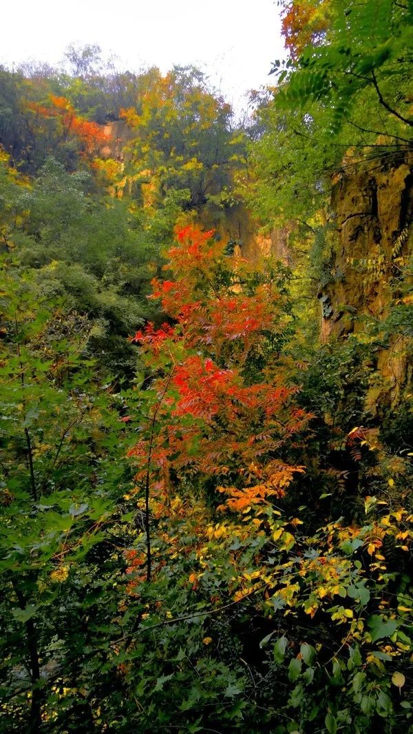 驼梁那烂漫山野的红叶中伴有金黄和翠绿的颜色