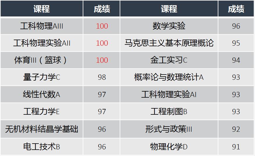 精益求精,成就至臻自我连续两学期的GPA满绩,加权成绩直达96.27,主修专业课程全部达到90分以上,高居无机非专业榜首。