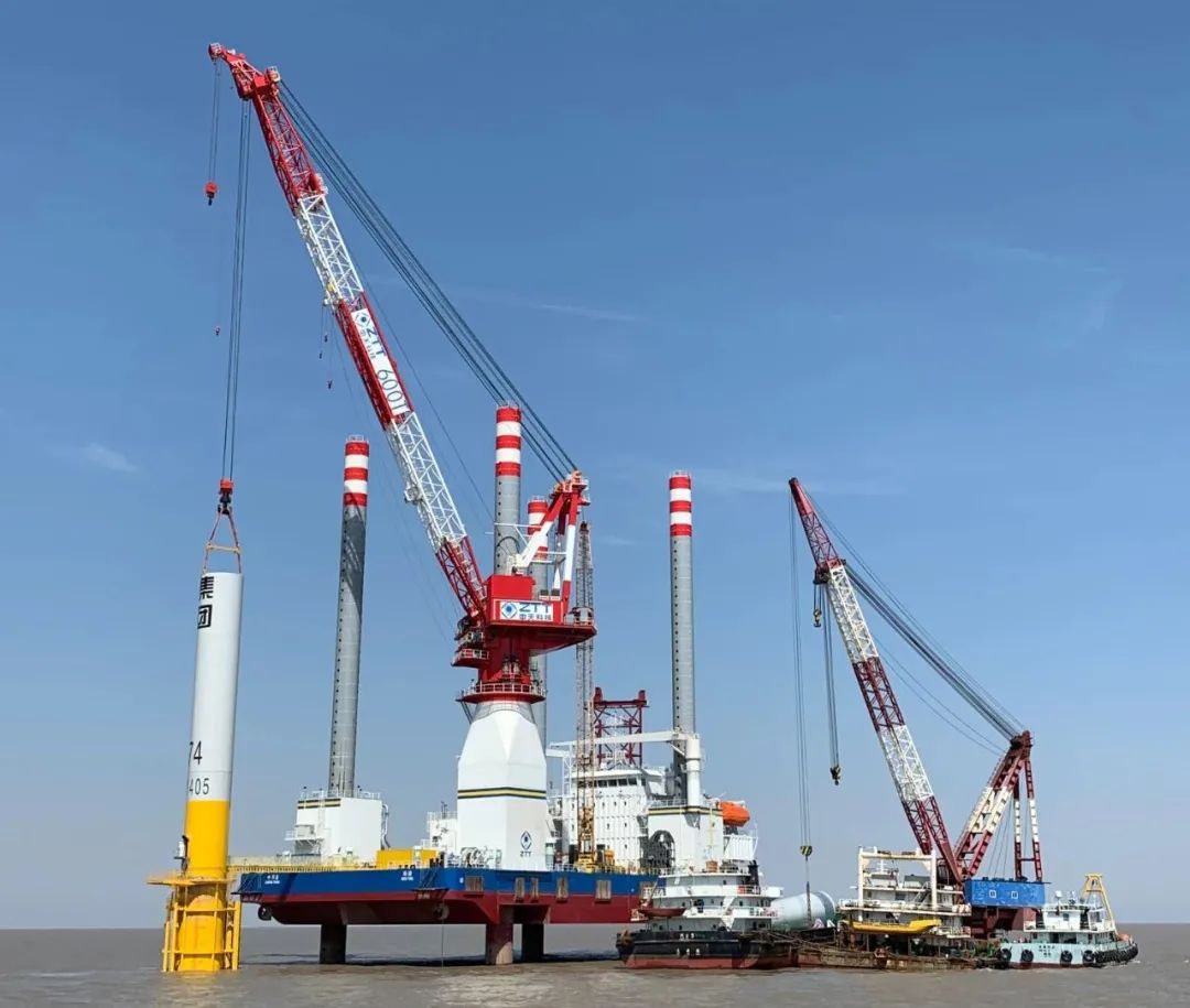 ▲2020年9月14日,重达3000吨的国华投资东台竹根沙H1#海上风电项目海上升压站正在吊装。江苏东台海上风电项目是目前我国已投产发电离岸最远、综合施工难度最高的海上风电项目。项目施工过程中通过技术创新,成功克服了浅滩工况、水流急、台风多、登陆难度大、离岸远、海缆长等困难,顺利完成了建设任务。其中,16号风机采用单桩基础风机整体吊装,是全球范围内首次成功应用单桩基础风机整体吊装技术,填补了全球海上风电吊装技术领域空白。这一技术工艺能够有效减少海上施工工序、缩短海上安装时间、提高安全作业系数,为全国海上风电往深远海域拓展做出了有益探索,具有开创性的意义。