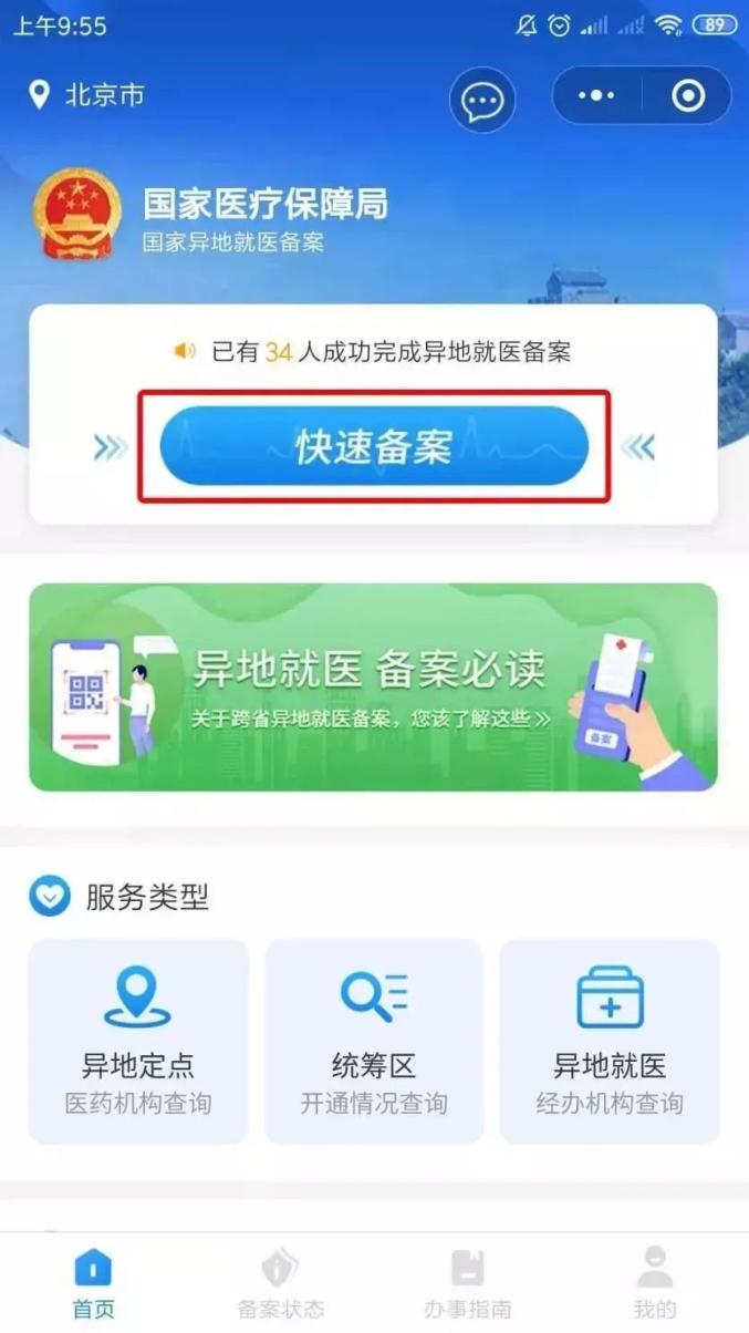 二、如何通过小程序快速备案?点击首页中间【快速备案】按钮,进入快速备案。足不出户,5分钟内就能为自己或者为他人申请异地就医备案了。