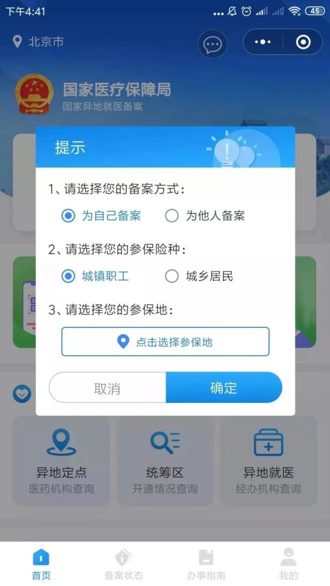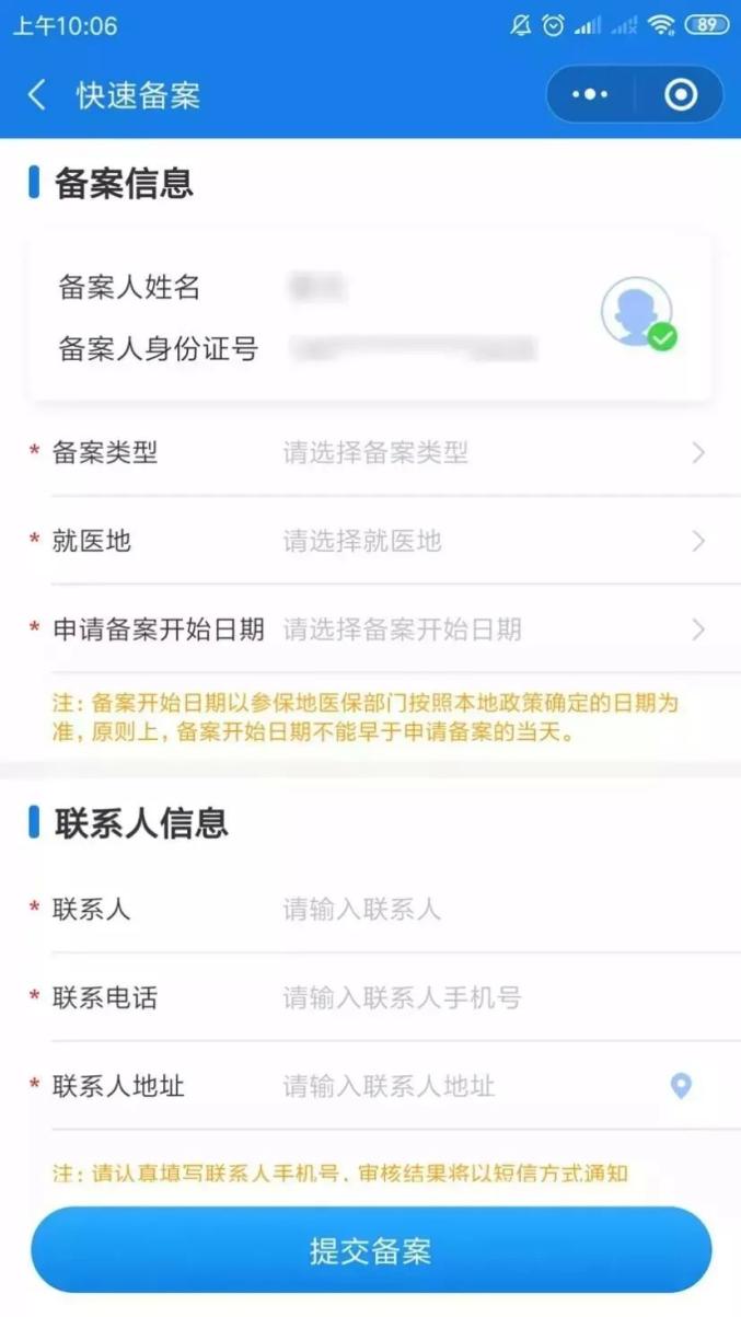 ① 点击【为自己备案】,选择参保险种与参保地,确认进入申请页面。