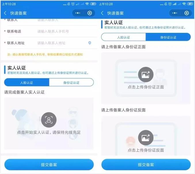 ④ 为他人备案需要备案人实人认证,可直接通过人脸认证或者上传备案人身份证正反面进行认证,认证成功后即可提交备案。