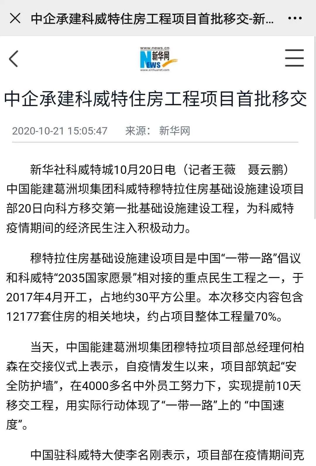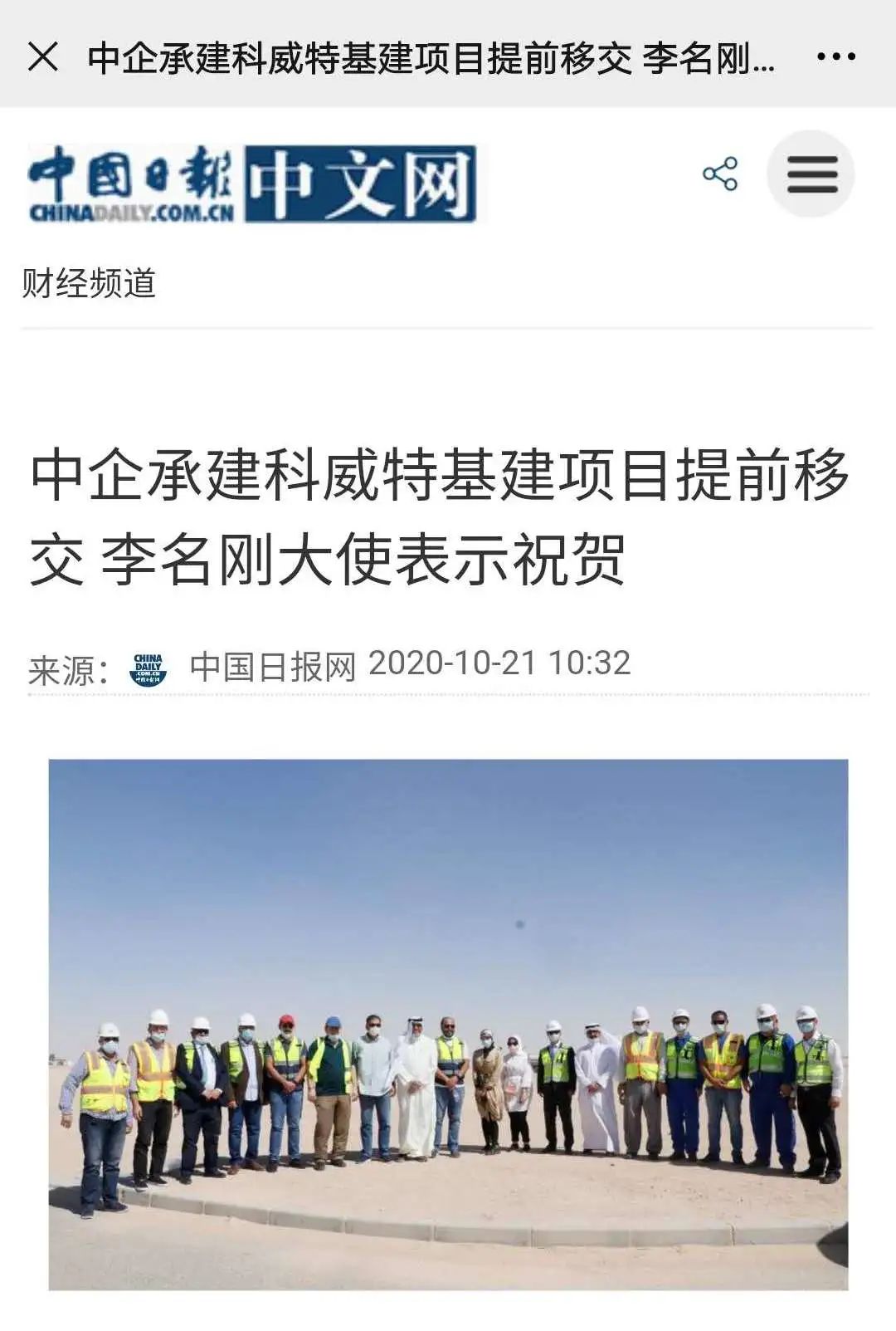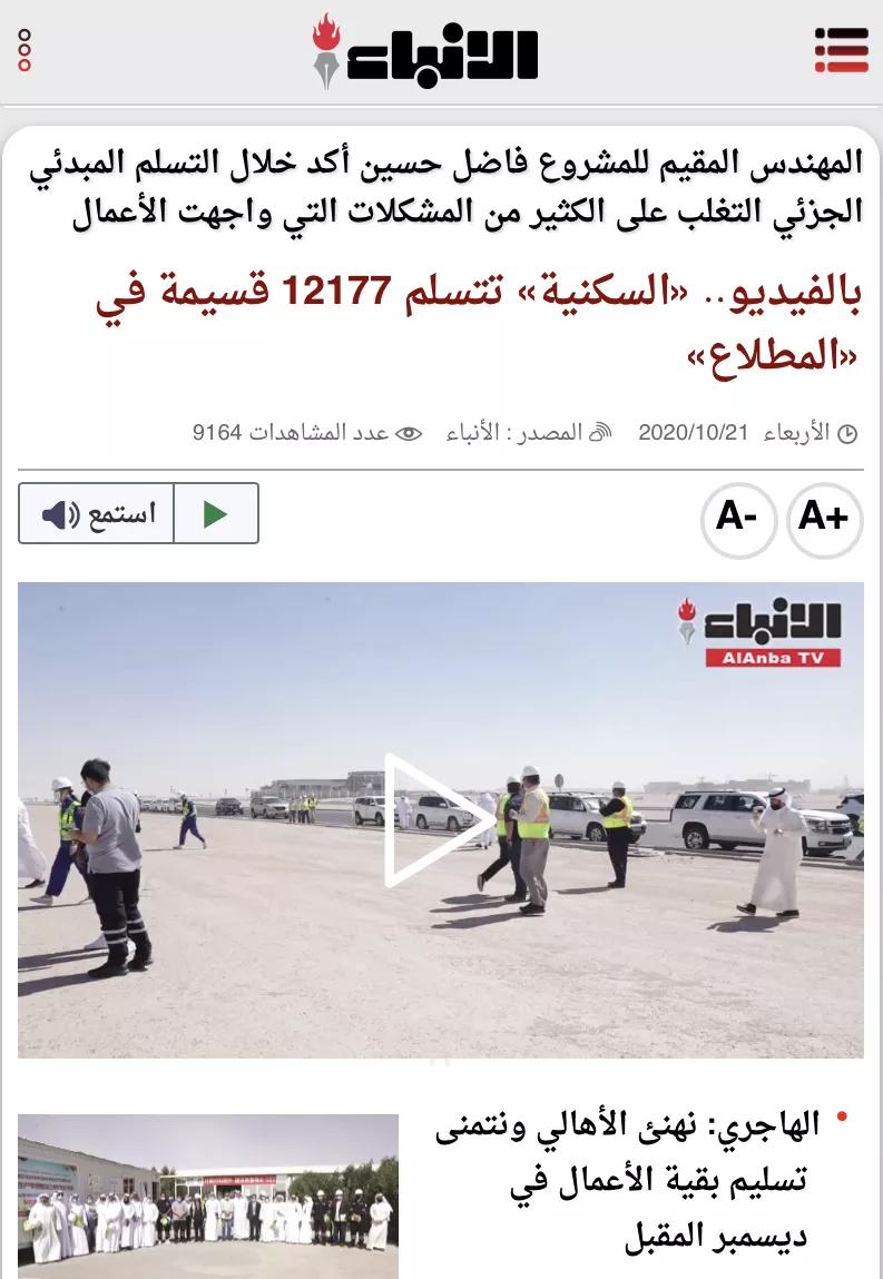当地时间10月20日上午9点30分,中国能建葛洲坝集团承建的科威特穆特拉住房基础设施建设项目完成第一批移交,比预定时间提前10天,在疫情期间交上一份漂亮的履约成绩单,展现了“一带一路”上的“中国速度”和央企担当,受到新华社、人民网、中国日报网、科威特《消息报》等中外主流媒体广泛关注。