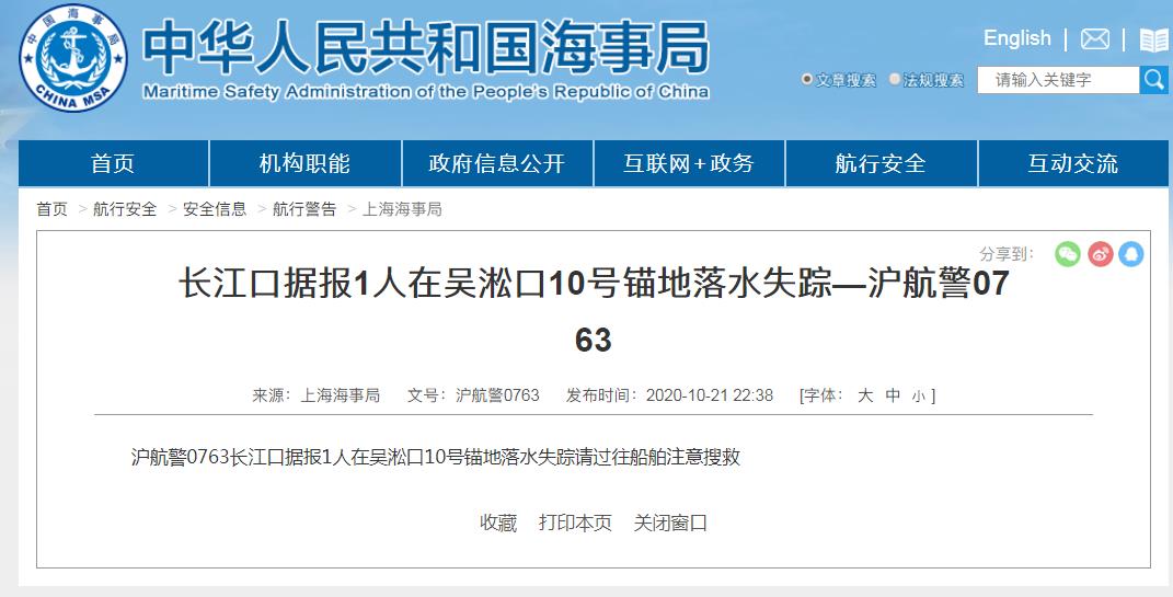 (原标题:长江口据报1人在吴淞口10号锚地落水失踪—沪航警0763)