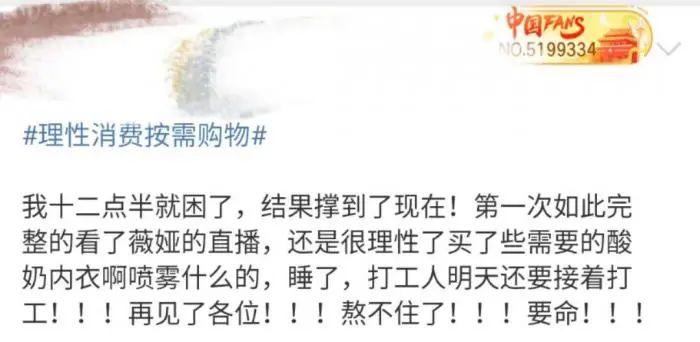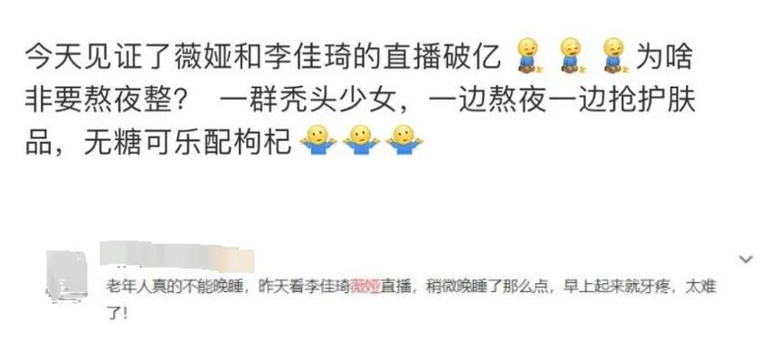 直播间的热度的到底有多高呢?以李佳琦的直播间为例,他在直播间上线了一款价值11280元贵妇面霜,就连他本人也想要抢购,可就在商品上架后,就显示库存不足,已经被秒抢。那这群秃头少女顶着黑眼袋,敷面膜熬夜看直播又如何呢?她们最大的收获就是困,薇娅与李佳琦的直播,将重头戏都放在后半夜,为了能够抢到心仪的产品,熬夜是必然。