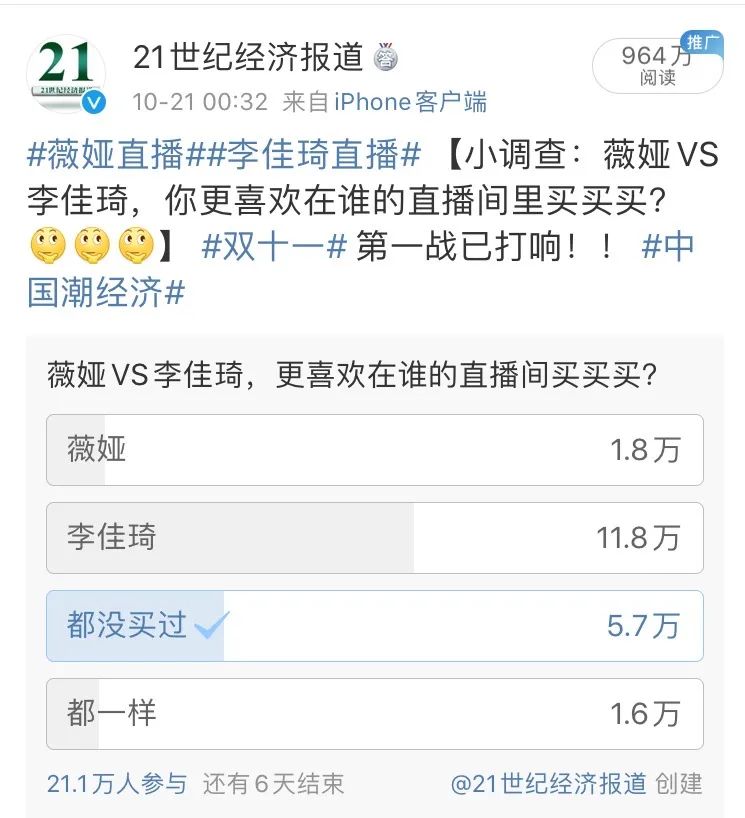 对于双十一的第一场直播,李佳也在直播结束后做出了总结。对于直播中出现的不足,向大家说声对不起。其次还是希所有女生都能理性消费,快乐购物。据21世纪经济报道官方微博发布的调查显示,11.8万网友更喜欢在李佳琦的直播间“买买买”,1.8万网友则更倾向于在薇娅直播间购物,还有1.6万网友表示没有明显偏好。