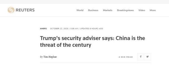 攻击中国,又开始了。“特朗普的安全顾问说:中国是世纪威胁。”路透社21日以此为题报道称,美国总统国家安全事务助理罗伯特•奥布莱恩当天面对英美军方与情报官员,再次抹黑攻击中国,还渲染称中国是一个“试图垄断21世纪所有重要行业的恶意竞争对手”。