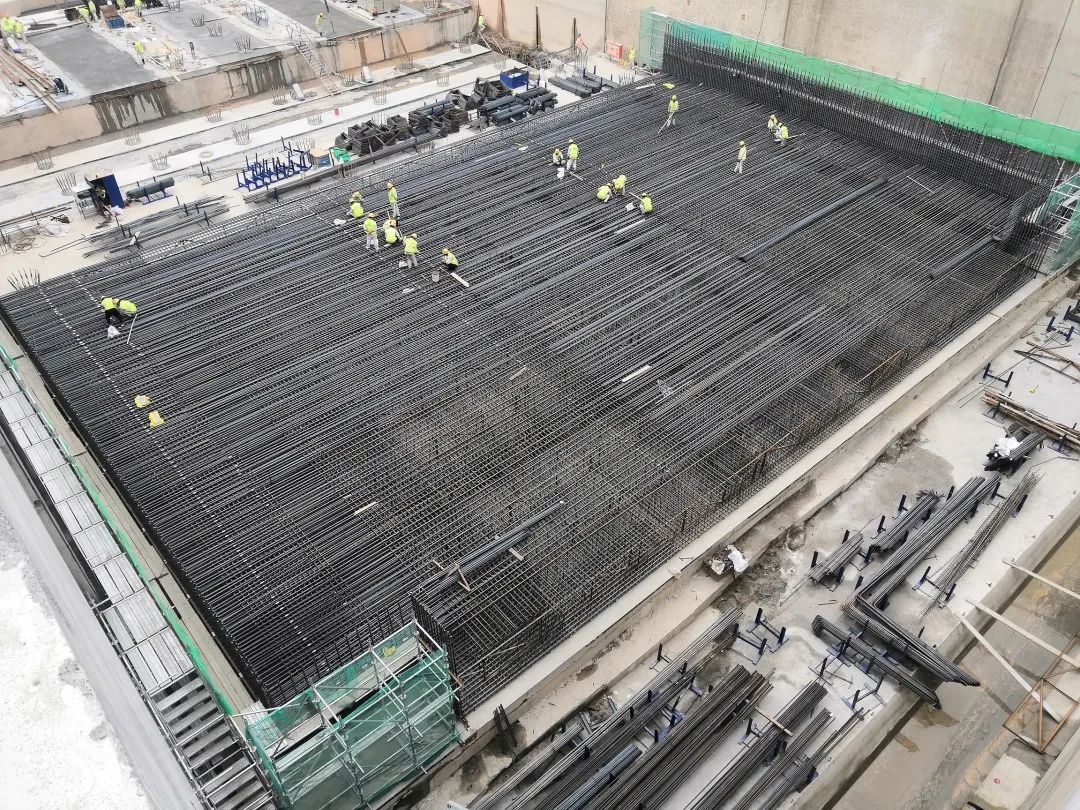 工期紧迫,刻不容缓。张超带头组建了技术小组,决定与困难一决高下。那段日子,他白天带着施工员在现场研究工艺,晚上回去撰写方案、比选工艺,经常忙到凌晨三四点,困了就在办公室眯一会。功夫不负有心人,他们终于研究出网片式钢筋整体绑扎法,简单来说,就是在空地搭建一个能够固定间距的钢筋绑扎架构,由8根钢板焊接成一个9宫格架构,其中4根横向钢板每间隔8.5厘米就设一个圆孔或卡槽,钢筋只要对着圆孔或卡槽穿插便能保证绑扎精度,待整片钢筋绑扎完成后再由起重机将其吊入现场进行安装和对接。新方法在保证钢筋绑扎质量的同时,效率也足足提高了1倍有余。“这钢筋绑扎得真规矩,竖向垂直划一、间距一致,水平没有一丝起伏,精度可以说是百分百了。”监理赞不绝口。