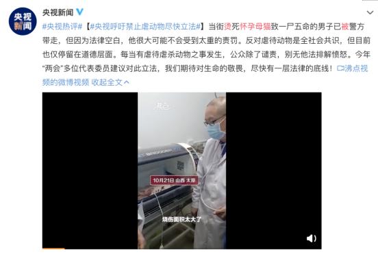 开水烫猫事件一经曝光,央视新闻就发表热评呼吁禁止虐动物尽快立法。