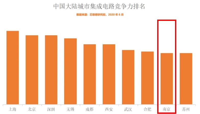 芯思想研究院今年6月发布的2020年中国大陆城市集成电路竞争力排行榜显示,长三角有上海、无锡、合肥、南京、苏州5个城市上榜。前十强中,南京排在长三角第4位、全国第9位。