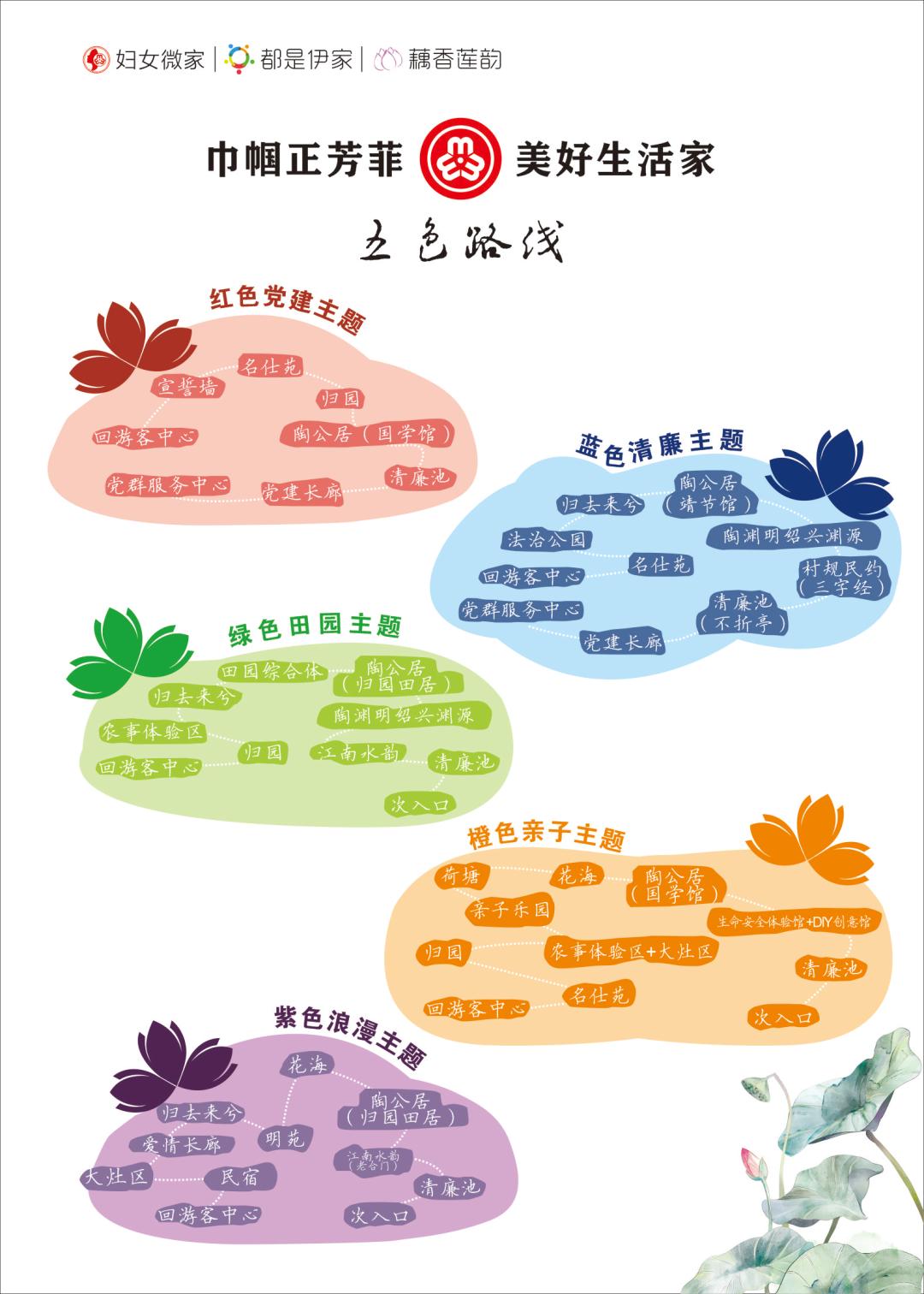 倾心打造五色主题服务。依托景区不断提升改造的服务和游乐设施,将多个旅游节点和活动体验“共享同乐”,总结提炼出五项精品主题服务路线,分别是党建引领巾帼建功,红船女儿逐梦新时代的红色精品党建主题路线;国学经典萌宠乐园,亲子互动课寓教于乐的橙色亲子活动主题路线;清廉池畔家风传承,贤良内助筑廉政院墙的蓝色清廉家风主题路线;荷塘人家醉美田园,妇字双创助乡村振兴的绿色美丽田园主题路线;栈道悠扬灶火温暖,浪漫缘起藕花深处的紫色悠闲浪漫主题路线。