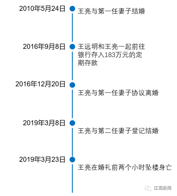 王亮有两段婚姻,第一段是在2010年,他和前妻李婷结婚,并且有一个儿子,2016年离婚。王亮在2018年认识了现在的妻子韩蕊,一年后,他们登记结婚。这些王远明都是后来才知道的,“孩子也不告诉我他感情的事情”。王亮死后,王远明想起王亮结婚前曾向他要了14万,说是做生意用的,“这笔钱应该是王亮用来置办结婚物品的。”