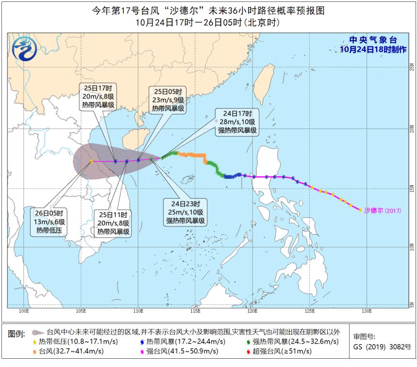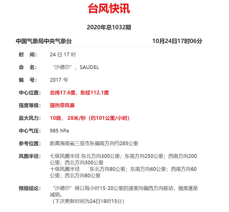 ��台风最新消息��今年第17号台风“沙德尔”(强热带风暴级),24日17时距离海南省三沙市偏东方向约285公里,中心附近最大风力10级(28米/秒)。预计其将以每小时15-20公里的速度向偏西方移动,强度逐渐减弱,于24日夜间到25日凌晨擦过海南岛南部,不排除在本岛陵水到三亚沿海地区登陆的可能性,之后趋向越南中北部沿海。