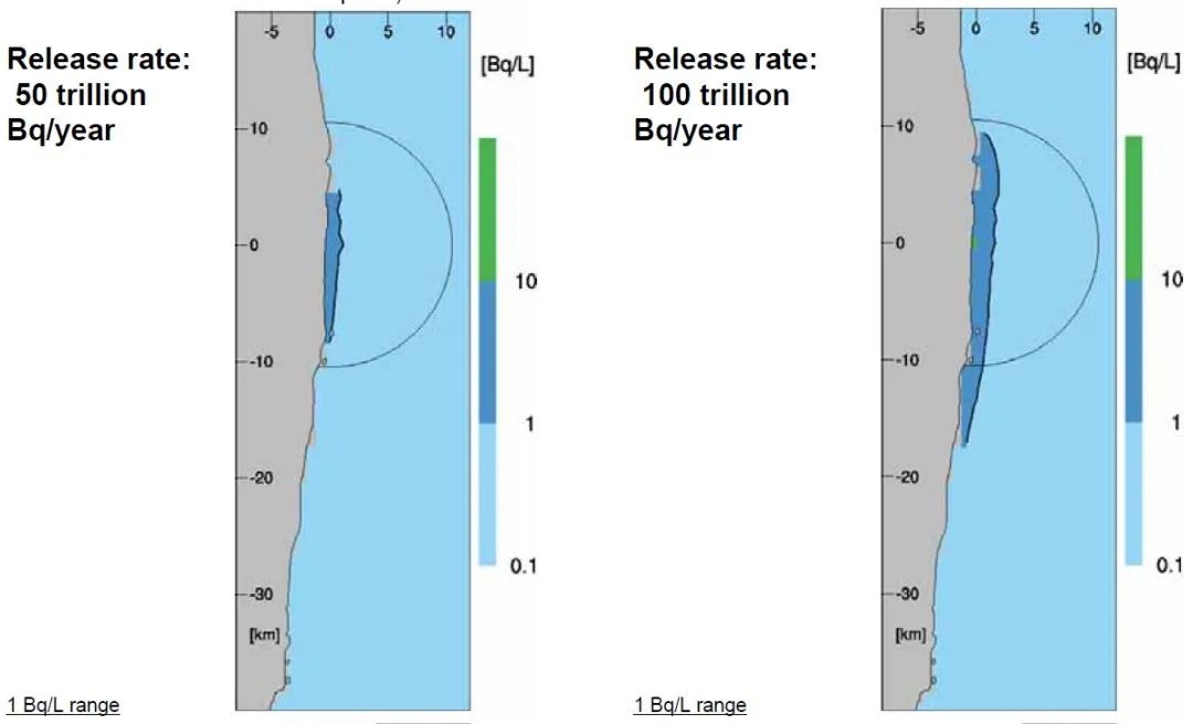 而除了难以去除的氚之外,处理后的污水中一些其他放射性同位素也要高度警惕,包括碳14、钴60和锶90。虽然这些同位素的含量远低于氚的含量,但它们在不同污水处理罐中的含量可能存在很大差异,并且需要更长的时间降解,且与海洋生物如鱼类具有很强的亲和力,对人类具有潜在的毒性。例如,碳14在鱼体内的生理浓度可能是氚的5万倍。而钴60能在海底沉积物中富集,浓度可能会上升30万倍。