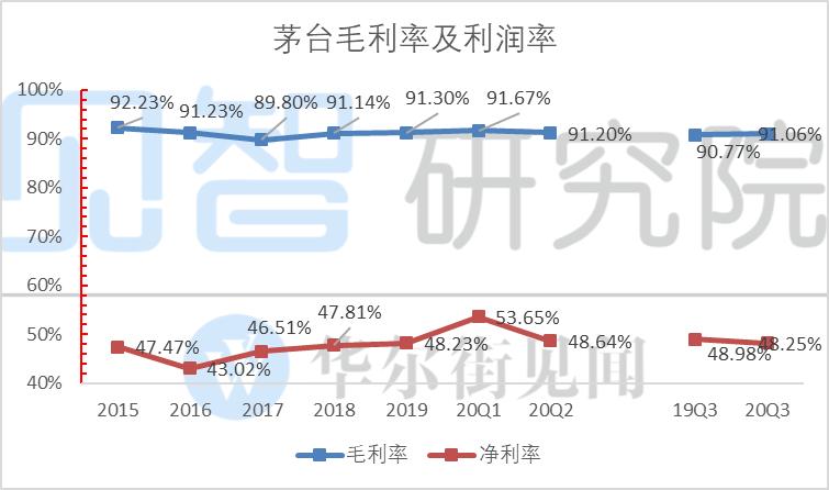 20Q3毛利率91.1%,同比上升0.29百分点,主要由于单价较高的非标产品投放占比提升和系列酒销售占比下降所致;净利率48.25%,同比下降0.7百分点,主要由于税金率和管理费用率上升。