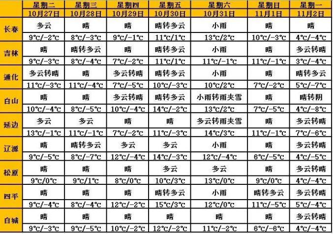 今天午后到夜间,全省多云有时晴,吉林东部、通化、白山、延边、长白山保护区有小雨或雨夹雪。今天夜间四平地区最低气温为-1度左右,其他地区2~3度;明天白天延边地区最高气温为13度左右,其他地区9~11度。