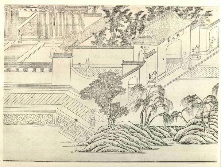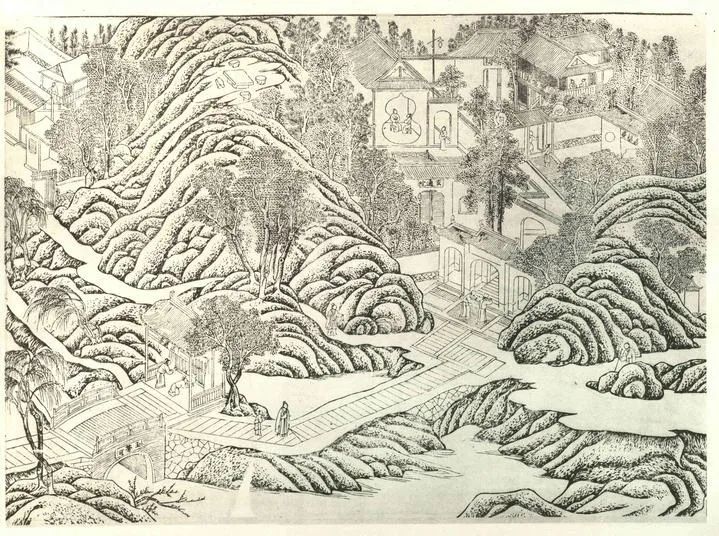 《环翠堂园景图》(局部图),明万历间休宁汪廷讷刻本我的爱人毛茸茸,也是范老师的学生,她的硕士论文题目就是《〈环翠堂园景图〉新考——汪廷讷的园林与图像世界》,以《环翠堂园景图》为主线,由汪廷讷的刻书事业与交游圈入手,探讨晚明文人的刻书、造园与生活。