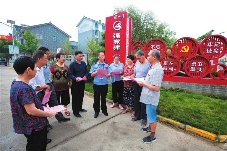沈云如(左一)到群众家中回访,了解他们的生活近况。他叫沈云如,是湖州市长兴县公安局虹星桥派出所的民警。