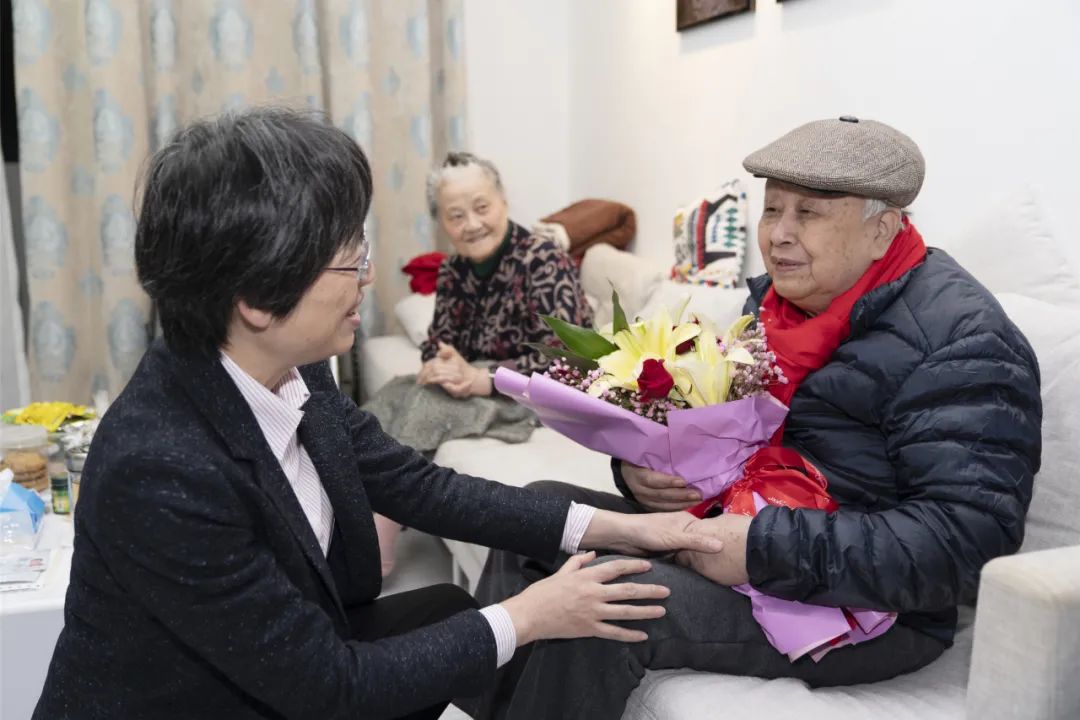 郑莉书记为施忠传老同志(右二)送上祝福并合影