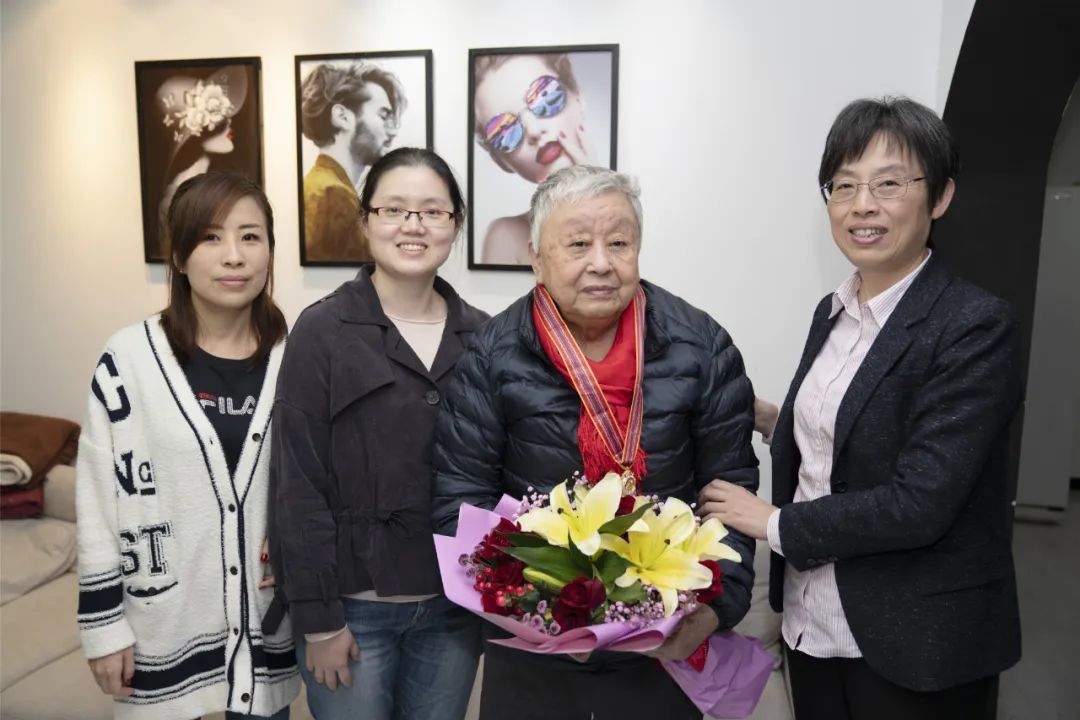 郑莉书记为钮廷琨老同志(右二)佩戴纪念章并合影