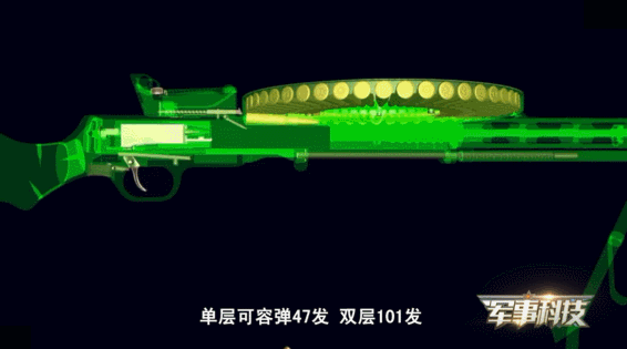 弹盘平放在枪身的上方,单层可容弹47发,双层101发。发射机构只能进行连发射击,枪口初速每秒840米,最大射程3000米,有效射程800米,战斗射速每分钟80到90发。