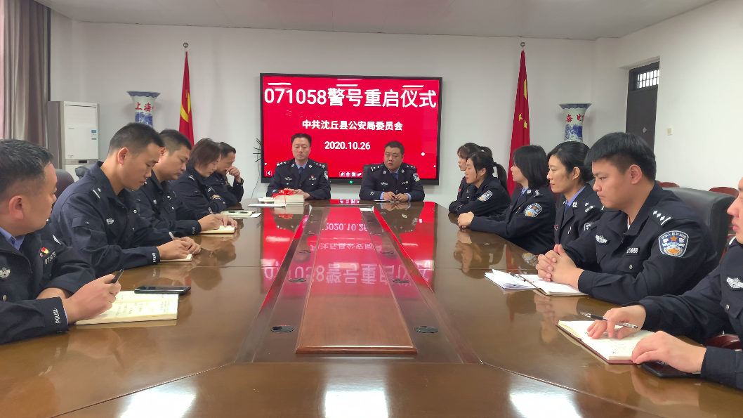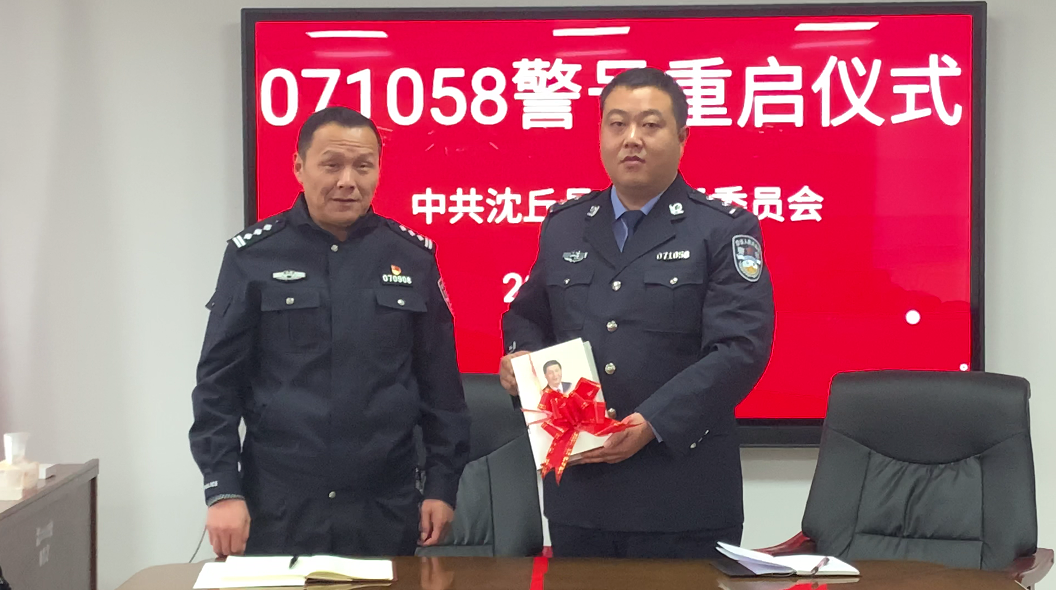 “我将视071058警号为终生从警荣誉,继承父辈红色基因,忠诚践行习近平总书记重要训词精神,献身于崇高的人民公安事业”。10月26日上午,沈丘县公安局党委会议室内,重启二级英模巴进同志071058警号仪式,简朴而隆重,气氛凝重庄严。公安部二级英模、原沈丘县公安局纪委副书记、警务督察大队大队长巴进同志的长子——巴舜巍从党委委员、政办室主任黄长春同志手中接过《沈丘县公安局党委关于重启071058警号的决定》后,面向人民警察警旗宣誓。