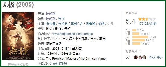 关于《无极》,如今众说纷纭,很多人说它没那么烂,不过只要观察过《无极》的豆瓣评分,就能发现它依然坚挺地停留在6分以下,比郭敬明写的小说版还低!