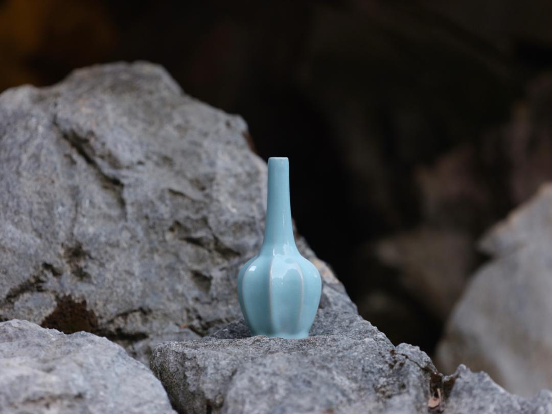 葵口瓶为古代传统造型之一,此瓶整体呈花瓣造型,瓶口微外移,腹下内收,圆足,线条温柔婉约,古朴优雅,犹如一朵含苞待放的花朵,待人采撷。五条内凹外凸线,使瓶口和瓶身自然形成花瓣纹理,起伏环绕,美在其中。其釉质匀润,色泽天青,表面布满如同知了翅膀般若隐若现的开片,称作蝉翼纹。胎釉结合处略显红晕,灿若云霞,整体气质静谧典雅,用放大镜观察,可看到釉下寥若晨星的稀疏气泡。手掌轻抚釉面,微微湿润,仿佛有水在釉面和手掌之间流动,为之惊叹。