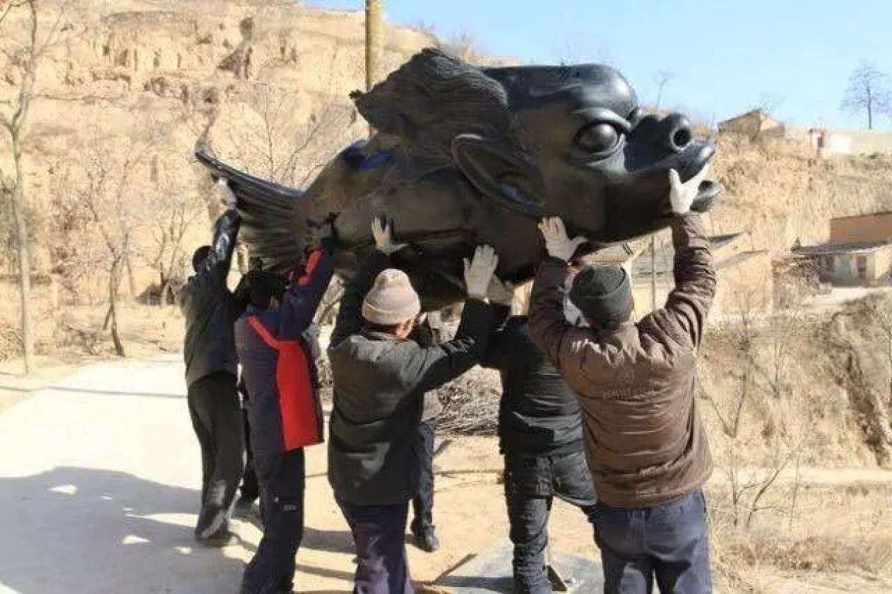 十月初晴朗的一天。甘肃小村石节子的村头,那条乌黑的、两米多长的不锈钢鱼人雕塑换新了,在夕阳下锃亮。雕塑下面,堆放着一个个蛇皮袋子,装的是从秦安县城运来的煤。今冬的煤送货上门,省了村里人下山拉煤的力气。一个身形瘦弱的村民推了个独轮小车,一袋一袋推煤回家。山路太窄,汽车到不了他家的土屋跟前。他家穷,40多岁了讨不到媳妇,和母亲相依为命。