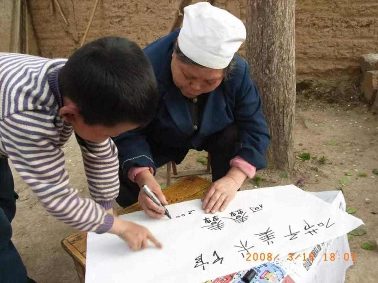 美术馆的题名是村民何蠢蠢写的。确切地说,是她一笔一划“画”出来的,因为今年80岁的何蠢蠢并不识字。她是靳勒的母亲。