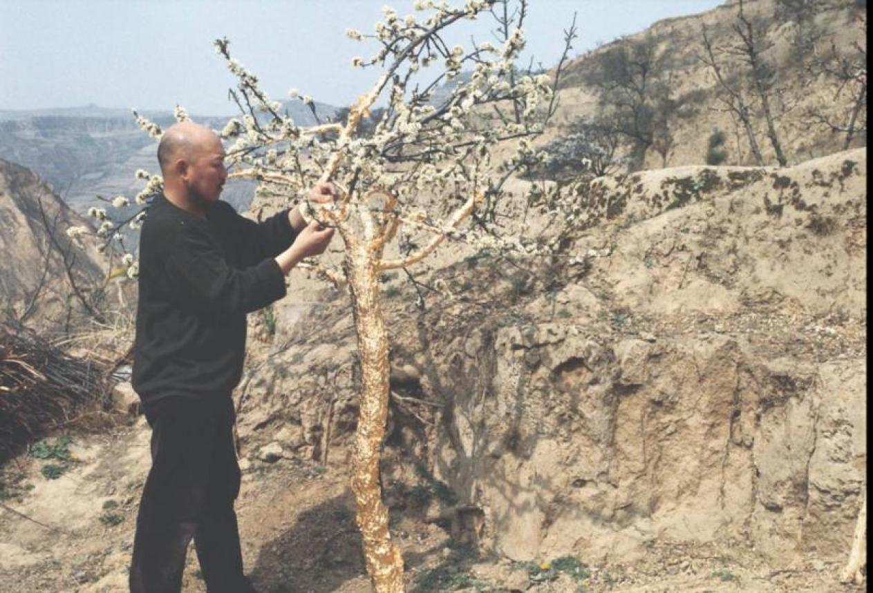 父亲在1970年代盖的院子,四堵土墙已风化变矮。院子后面父亲种的那棵李子树,长了40年,还没他的个头高。2005年春天,李子树开了一树白花,靳勒跪在树下,开始他的行为艺术《贴金》。他在树干上细细裹了一层金箔,小树变得金光灿灿。随后,他又用金箔包裹了父母睡的土炕黑乎乎的炕洞门,还包裹了母亲用了几十年的乌黑的推耙。他想用这种方式,让父母的寻常日子也庄严起来。