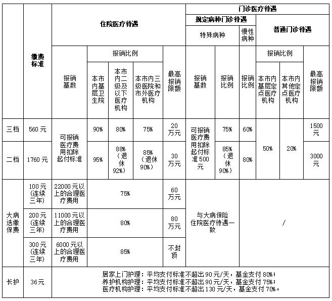1. 城乡居民基本医疗保险:二档个人缴纳1796元(含长护险36元、大病保险基本保费个人缴纳部分30元),三档个人缴纳596元(含长护险36元、大病保险基本保费个人缴纳部分30元)。