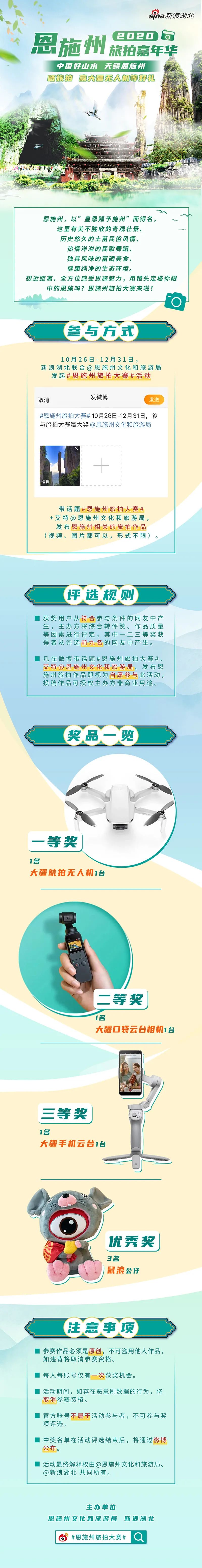 据悉,本次旅拍大赛在微博话题页中设置了入围区和排名区,网友们发布的恩施旅拍作品根据要求入选后,由转评赞数据生成排名。最终奖项将由恩施州文旅局和新浪湖北综合转评赞、作品质量等多维度进行评定,其中一二三等奖获得者将从评选前九名的网友中产生。活动将持续到今年12月31日结束。参与方式