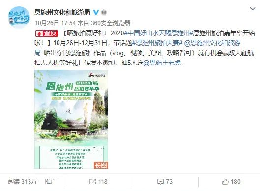 2020年10月26日,由新浪湖北和恩施州文化和旅游局共同发起的2020“恩施州旅拍嘉年华”活动正式上线,这是继2018年成功打造“中国好山水天赐恩施州”、2019年“恩施州好嗨游”等系列主题宣传后,再一次联手将恩施州送上微博热搜。在疫情消散春回大地之后,恩施州的文旅活动在各方支持和努力下已逐渐恢复正常,并在今年十一黄金周迎来高潮。借此契机,适时的推出旅拍主题活动,用无人机、口袋相机等极具吸引力的奖品来鼓励网友参与和分享,收获了极高的关注度和海量优质内容投稿。网友们通过图文、视频、航拍、攻略等形式,多维度、多角度展示和呈现了恩施州的魅力与风情,对全面提升恩施州品牌影响力,吸引湖北乃至全国游客到恩施旅游具有积极而重大的意义。