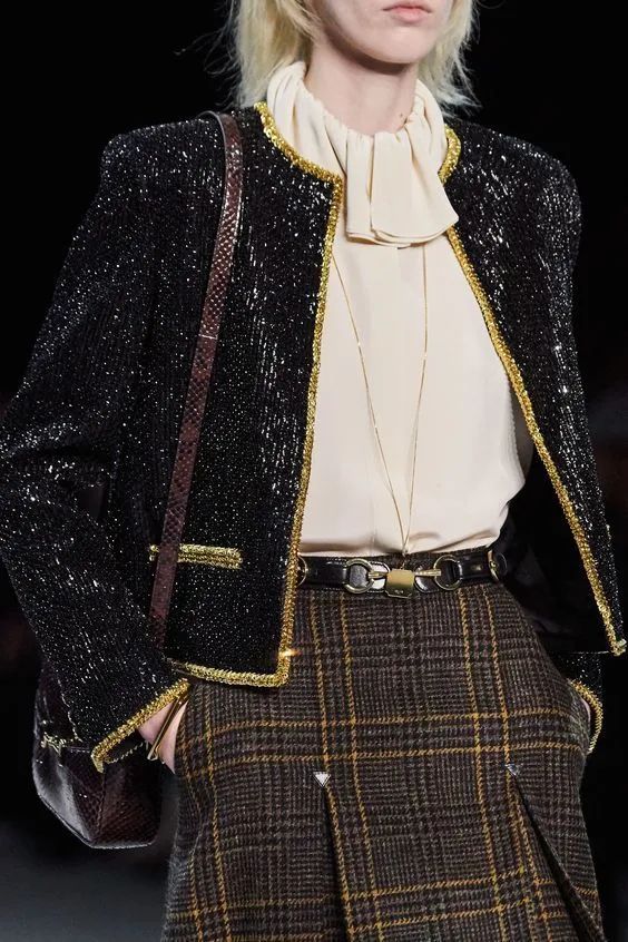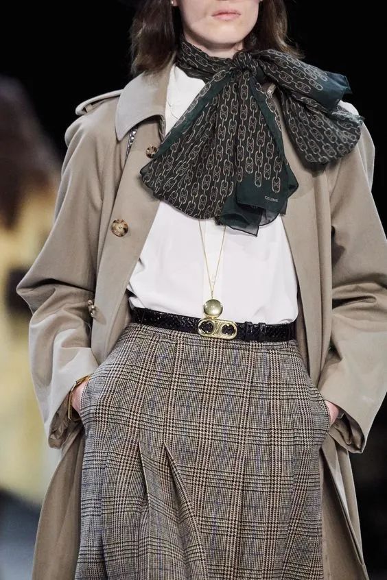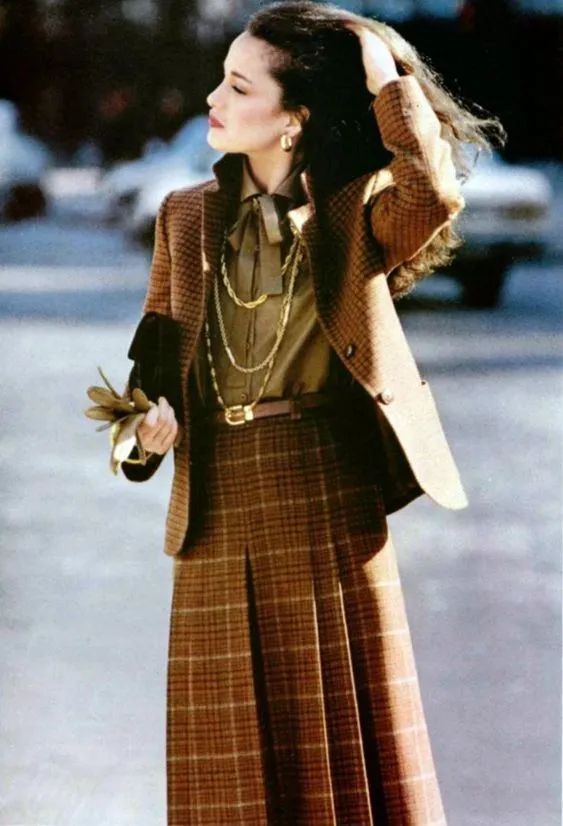 棕色系的西装外套、褶皱领丝绸衬衫、剪裁合身的长裤或是过膝长裙、腰间一条简简单单的腰带,再加上一双高筒靴......日常穿不会太正式,正式场合又不会显得不够隆重。