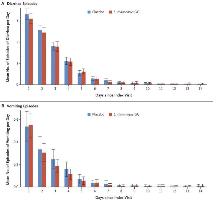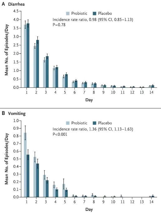 在PECARN试验中,研究人员共收纳了971名3到48个月患儿,这些患儿因患急性胃肠炎,到医院就诊,并将其随机分为益生菌组和安慰剂组,益生菌组每天两次服用LGG益生菌。随访2周后,益生菌组和安慰剂组中出现中重度胃肠炎的占比分别为11.8%和12.6%,并没有统计学上的差异。