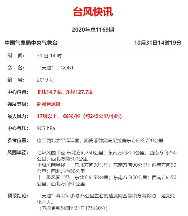 今年第19号台风“天鹅”(超强台风级),31日14时其中心位于北纬14.7度,东经127.7度,也就是在距离菲律宾马尼拉偏东方向约720公里的西北太平洋洋面上,中心附近最大风力17级以上(68米/秒),七级风圈半径为200~300公里,十级风圈半径为90公里,十二级风圈半径为50公里。