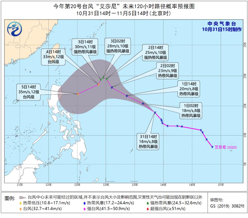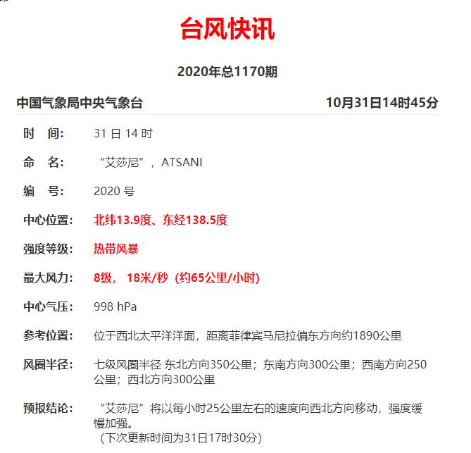 今年第20号台风“艾莎尼”(热带风暴级)的中心今天(10月31日)14时位于菲律宾马尼拉偏东方约1890公里的西北太平洋洋面上,就是北纬13.9度,东经138.5度,中心附近最大风力有8级(18米/秒),中心最低气压为998百帕,七级风圈半径为250-350公里。