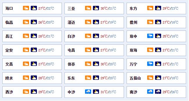 中沙黄岩岛,多云有雷阵雨,偏北风转西北风6级,气温:27-31度