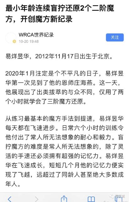 新闻中援引@WRCA世界纪录的官方消息称:易烊昱华在7岁282天的时候以1分50.66秒的时间成功解决了2个二阶魔方。