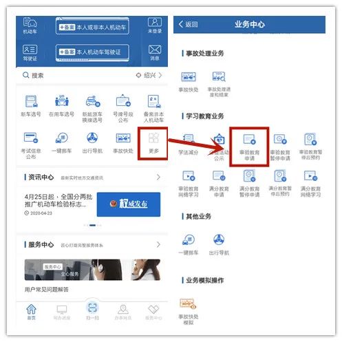 手机登录“交管12123”进入主页面,点击【更多】,进入业务中心,屏幕下拉在【学习教育业务】选择【审验教育申请】,再选择【现场教育】