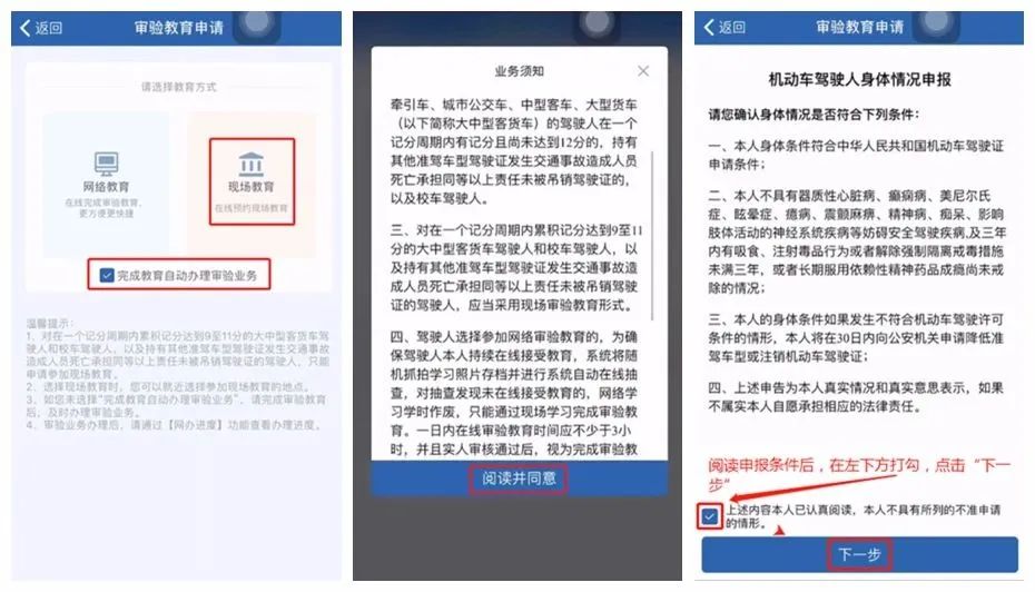 (一)管理规定:驾驶人根据交管12123平台注册、登录、提示步骤操作跟进,网上自主选择确定自己参加现场教育日期及时间,预约成功后,按自己选择的场次、地点参加现场学习的,需本人持居民身份证、驾驶证原件(参加审验现场学习的)、手机预约信息,提前十五分钟到现场有序进入。进出教室严格遵守“两个教育”工作规范所规定的要求次数及时间限制,及时填写签注进出时间及人员姓名,按时间要求完成现场学习和网上学习。在常态化疫情防控期间,请保持正确的社交距离,全程自觉正确佩戴口罩、积极配合查健康码、测体温,勿误防疫安全。