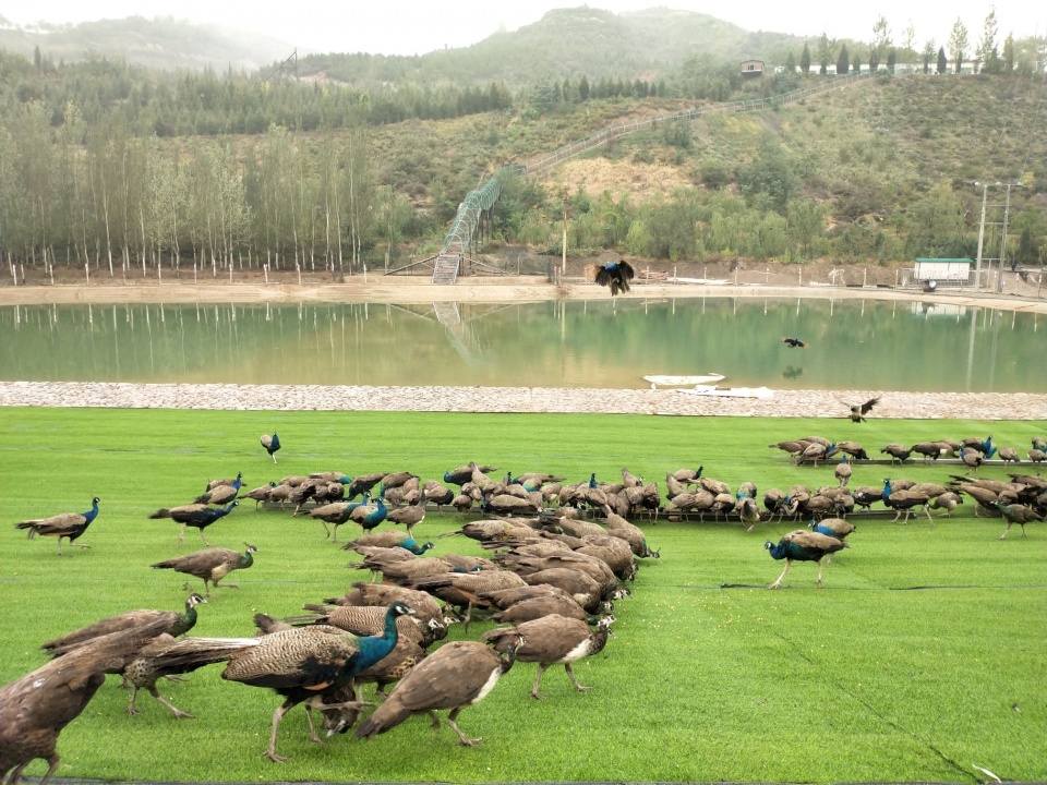 在大山里看到孔雀,真是惊艳。一大片绿油油的草坪,清亮的湖水前,看着一群斑斓的孔雀从山上徐徐飞落,“凤凰于飞,翙翙其羽”的场景浮现眼前,很难想象,这里曾是深度贫困县——娄烦县顺道村。