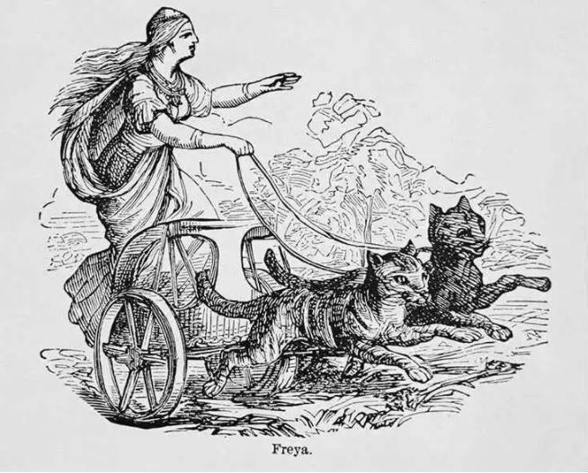 与古埃及、希腊、罗马神话一样,猫在北欧也占据了神圣的地位。北欧神话中,猫是芙蕾雅女神的化身,芙蕾雅掌管爱情、婚姻及亡灵,她的双轮战车正是由黑猫拖曳。给流浪猫喂食,就会受芙蕾雅女神的偏爱,她会给一切有善心的人带来好运与荣华富贵。
