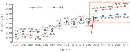 报告显示,我国2002~2017 年急性心梗死亡率总体呈上升态势,从 2005 年开始,急性心梗死亡率呈快速上升趋势,2013 年农村地区急性心梗死亡率超过城市平均水平。