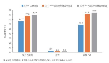 考虑到CAMI注册研究的时间限制,在《2019年中国成人STEMI医疗质量控制报告》中又将其与2017、2018年的中国医疗质量控制数据进行对比,结果显示与CAMI注册研究相比,2018年我国急性 STEMI 医疗质控数据显示:
